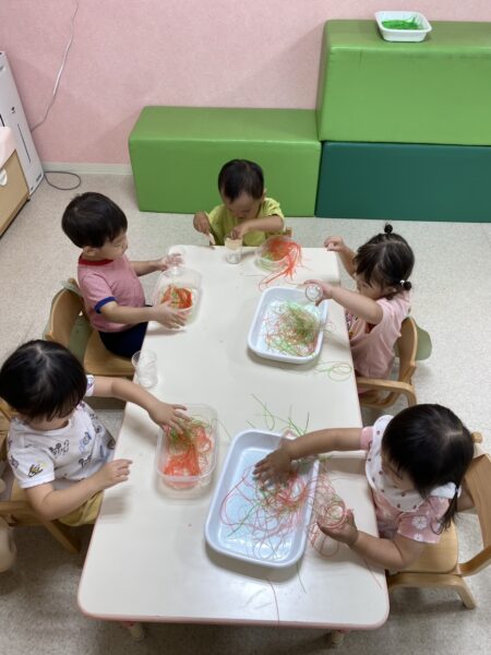 色のついたカラフルな春雨(食紅ですので安全です)を触って楽しみました。